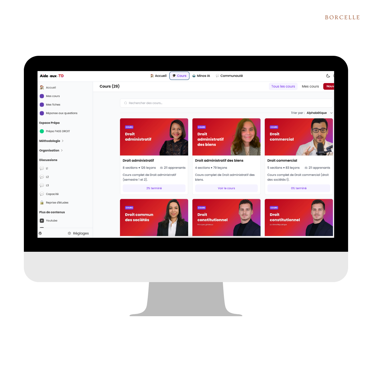 AideauxTD est une plateforme d’apprentissage en ligne dédiée aux études de droit. Elle propose des cours vidéo complets, des fiches de révision, des QCM, des flashcards, des annales corrigées et des outils d’intelligence artificielle pour aider les étudiants en Licence de droit, de la L1 à la L3 (et Capacité) à comprendre, réviser et réussir leurs examens.
