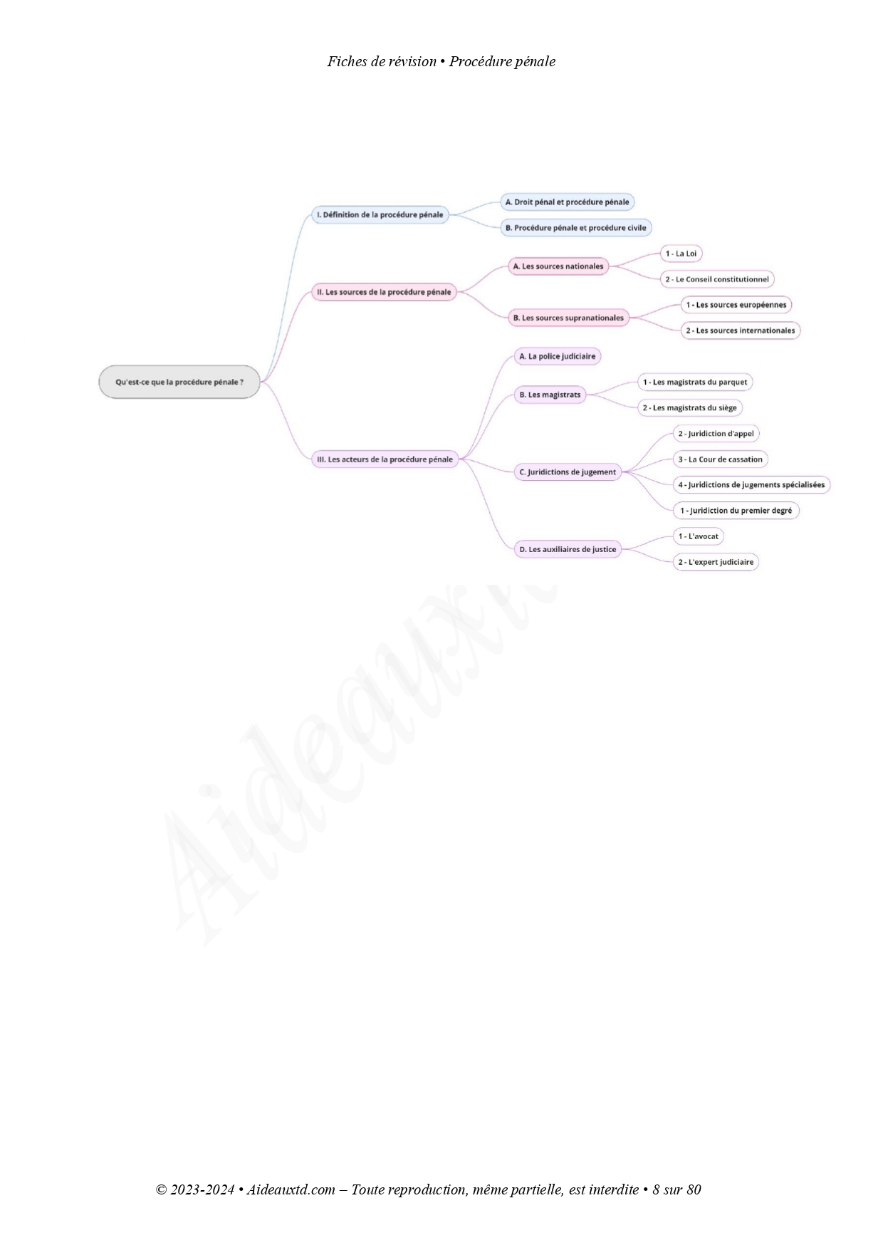 Vous pouvez utiliser les cartes mentales de Aideauxtd disponibles dans le Pack de fiches de Procédure pénale.
